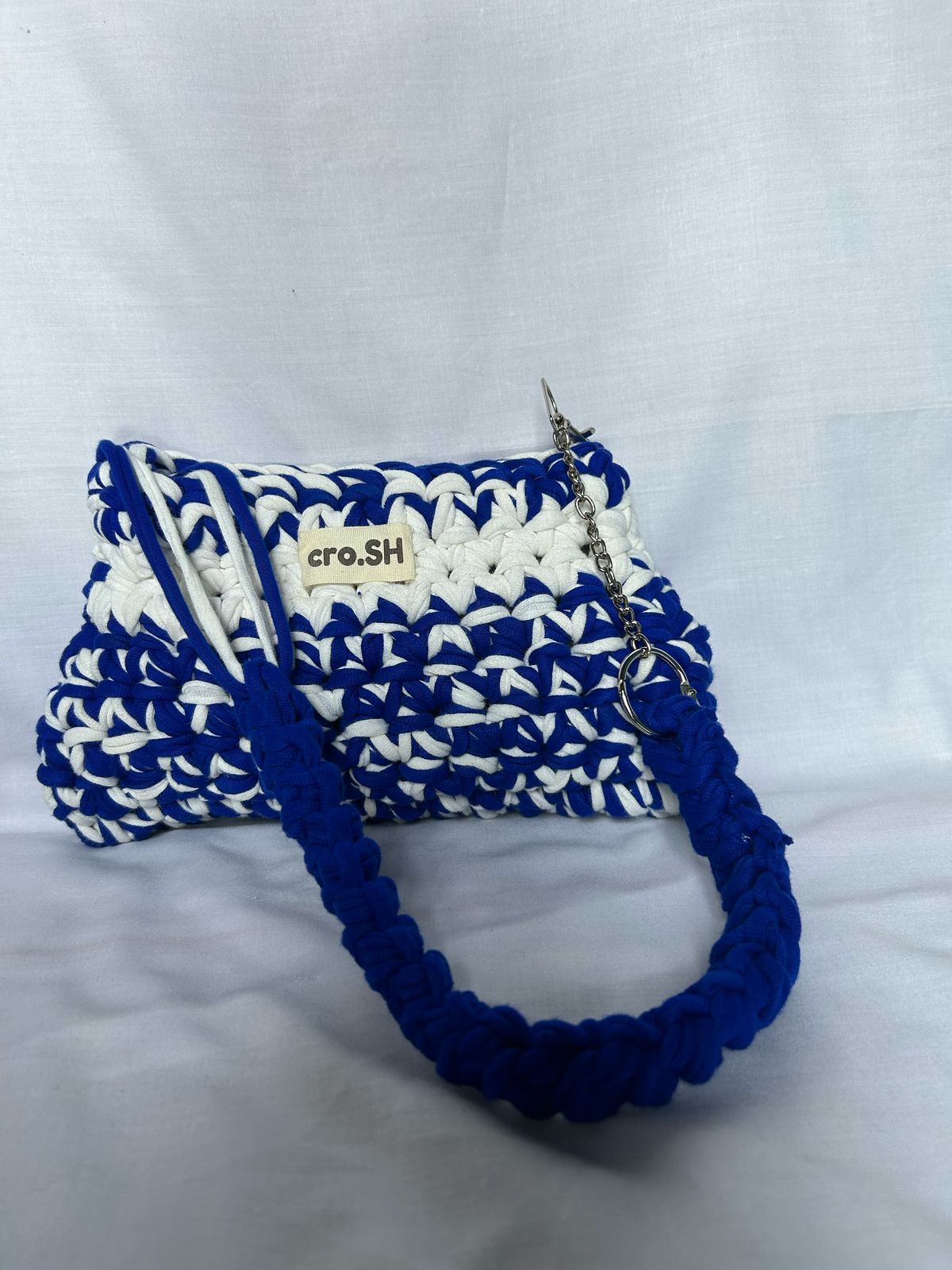 Beautiful crochet handbag with zip in a blue and white colour combination.